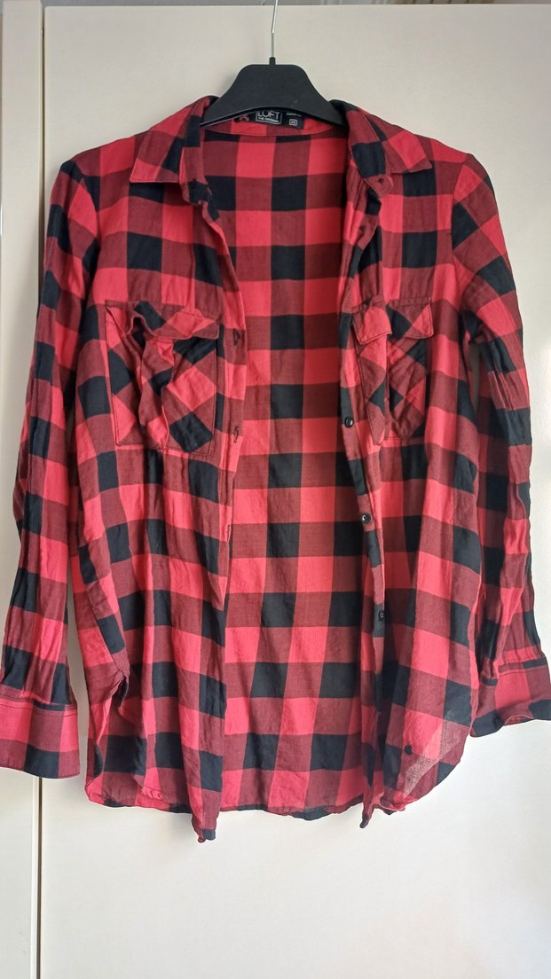 Uzun kollu, düğmeli, yakalı kırmızı-siyah kareli pamuklu gömlek. Rahat kesim, günlük kullanıma uygun grunge punk tarzında.