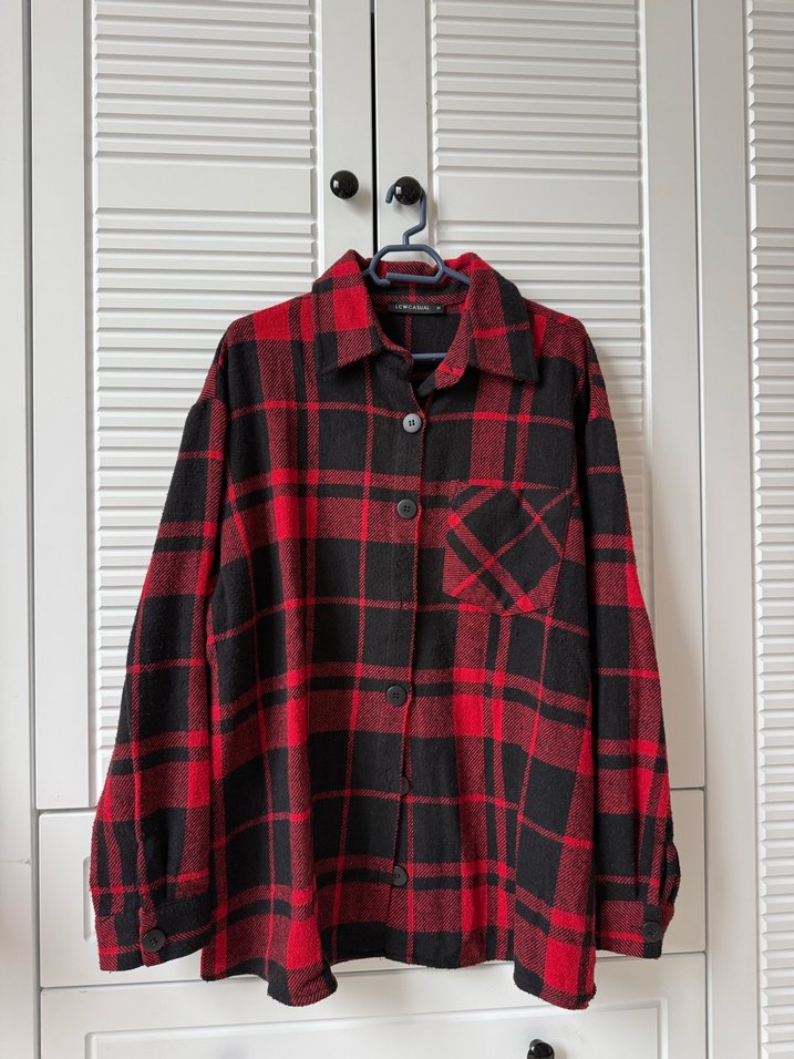 Düğmeli, uzun kollu, notched lapel yakalı kadın gömleği. Yumuşak ve sıcak kumaştan, koyu kırmızı siyah kareli desende, rahat kesim.