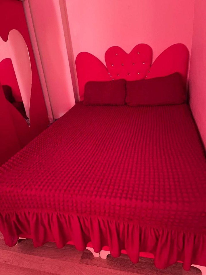 Canlı kırmızı renkte, kareli desenli yatak örtüsü. Üzerinde uyumlu yastık kılıfları ve etek kısmında fırfır detayı bulunur. ️ Bürümcük yatak örtüsü Çift Kişilik. 200/220 ölçü Yastık50*70 (2 adet) Gri Açık kahve Antrast Pudra Krem Mor Kakao Bordo Siyah Lila Yeşil Turkuaz Kahve Taş
