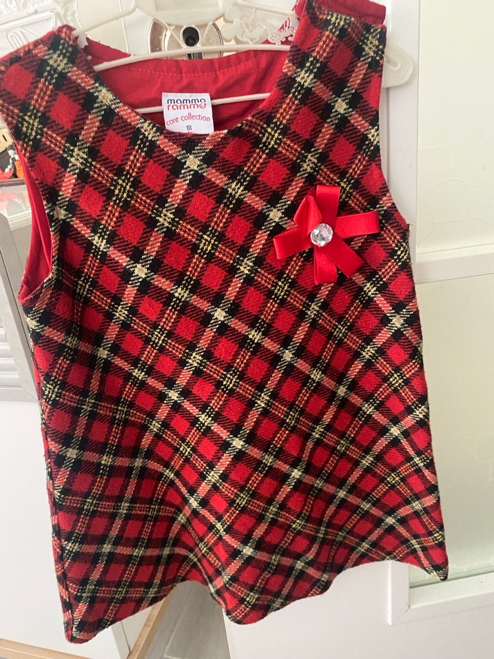 Kolsuz kız çocuk elbisesi, renkli kırmızı kareli desen, ve düğme detaylarına sahiptir. Rahat kesim ve yumuşak, sıcak kumaştandır. Taşlı kırmızı fiyonk süsü bulunur.