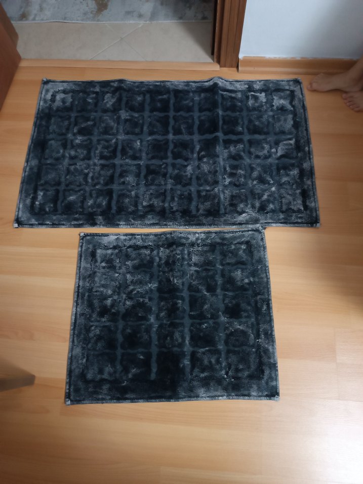 Yumuşak ve peluş dokulu, koyu gri kareli desenli iki parçalı banyo paspası seti.guncel fiyatı resimde ekli