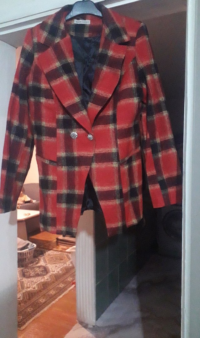 Koyu kırmızı kareli desenli, yakalı ve düğmeli kadın blazer ceket. Normal kesim, uzun kollu ve midi boyda, ofis için uygun. boy 75 iki göğüs arası 50 hiç kullanılmadı bebeğim etiketi kopardı
