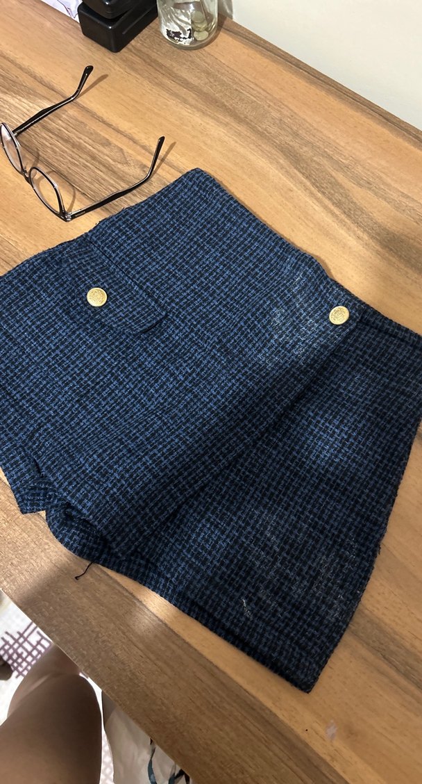 Kareli desenli ve iki dekoratif düğmeli koyu lacivert mutfak önlüğü, klasik bir görünüm sunar. Şort etek