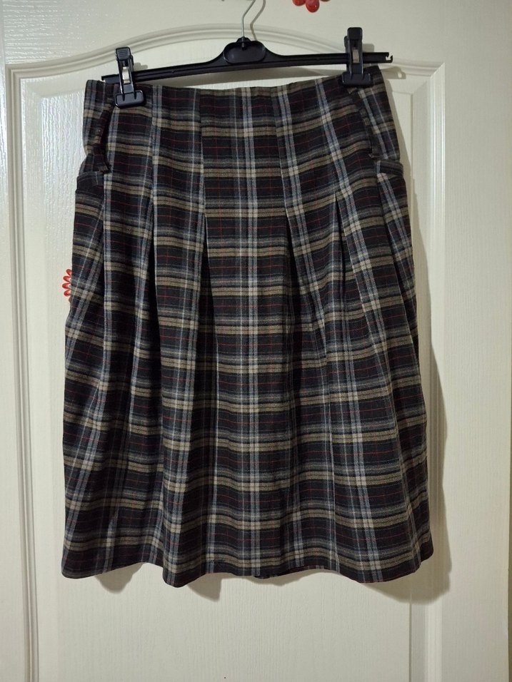 Yumuşak yün kumaştan, kareli desenli, pileli ve midi boy bol kesim etek. Rahat sokak stili için uygundur.