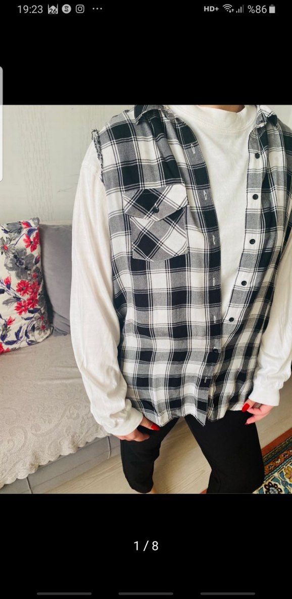 Gri ve beyaz kareli desenli, pamuklu, yakalı, düğmeli, normal boyda, bol kesim kadın gömleği. Günlük kullanıma uygun.