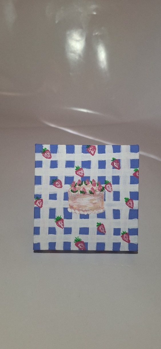 Bu masa örtüsü, çilek ve pasta desenleriyle bir tuval 10x10 verniksiz guaj boyali
