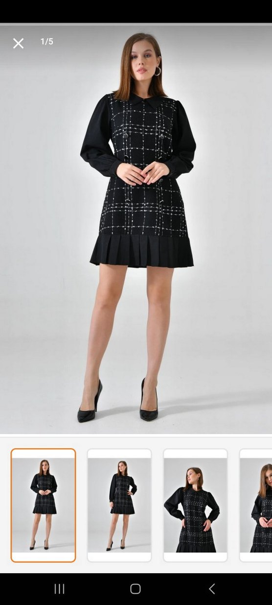 Siyah mini elbise, kareli desene sahip, uzun kollu ve pilili etek uçlu, yumuşak sentetik kumaştan üretilmiştir. Yuvarlak yaka ve regular fit ile ofis kullanımı için uygundur.