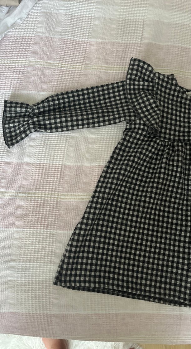 Kareli desenli, uzun kollu, bol kesim kız elbisesi. Sentetik yumuşak kumaştan, tekne yaka ve pliseli detaylara sahip gri renkli elbise.
