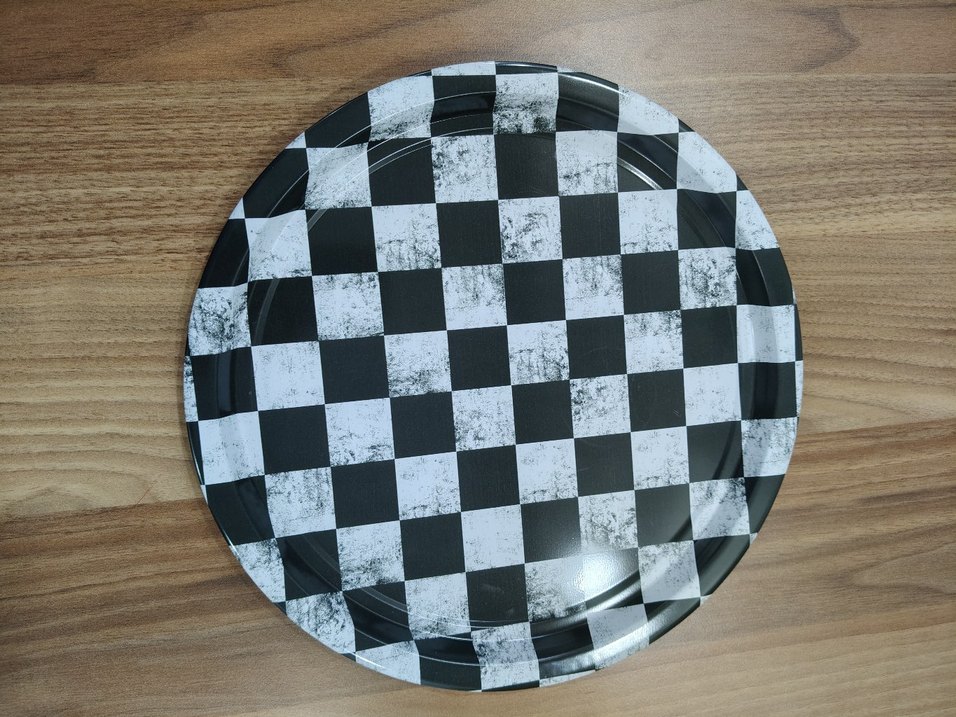 Yuvarlak, siyah ve beyaz kareli desene sahip, eski görünümlü koyu renkli tabak. Yemeklere karşıt kültür havası katar. ️