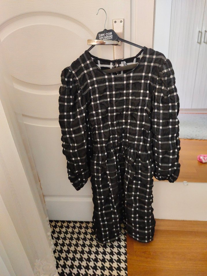 Kareli desenli, keten kumaştan, uzun kollu ve pileli rahat kesim elbisesi. Sokak modasına uygun şık tasarım.