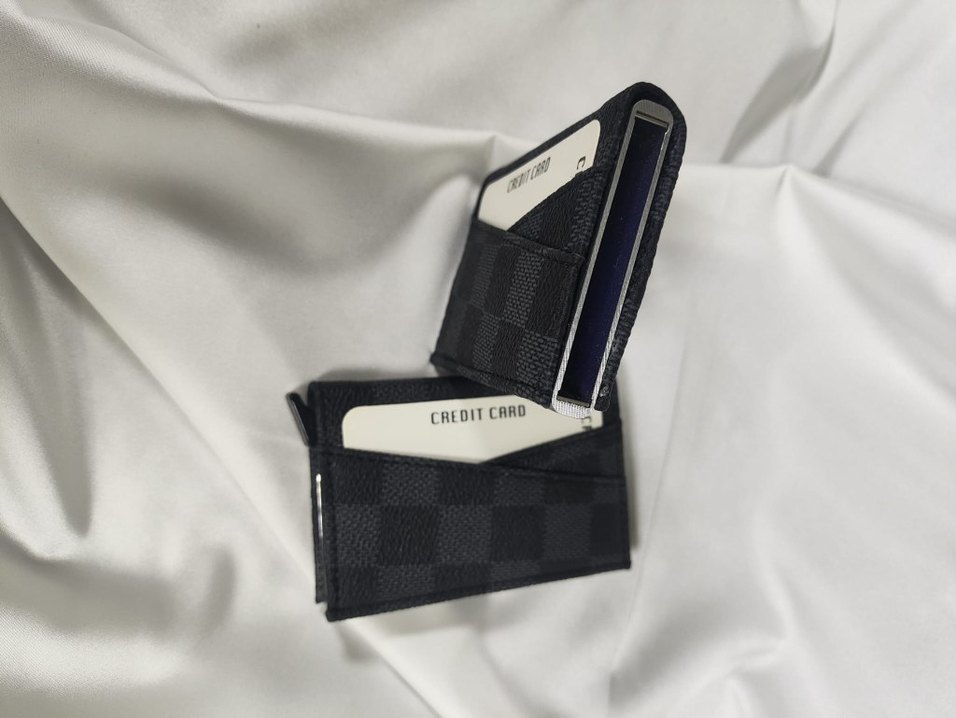 Kareli desene sahip siyah erkek cüzdanı, kredi kartları için çoklu bölmelerle sokak stili ve iş görünümünü birleştirir.