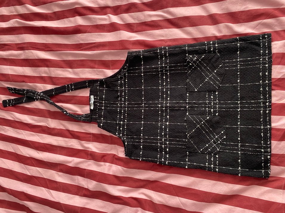 Kareli desene sahip siyah salopet, ön cepler ve ayarlanabilir boyun askısı ile kullanışlıdır.