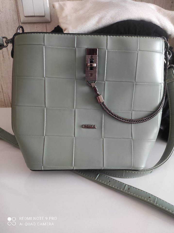 Yeşil deri kadın çanta, kareli desene ve tokalı kapanışa sahiptir. Günlük kullanıma uygun, çağdaş ve trend sokak stili ile uyumludur.