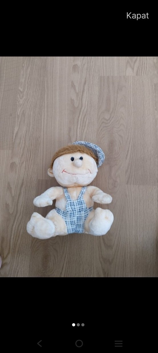 Bej yumuşak kumaştan yapılmış, pastel kareli tulum ve şapka giymiş, gülen yüzlü peluş oyuncak.