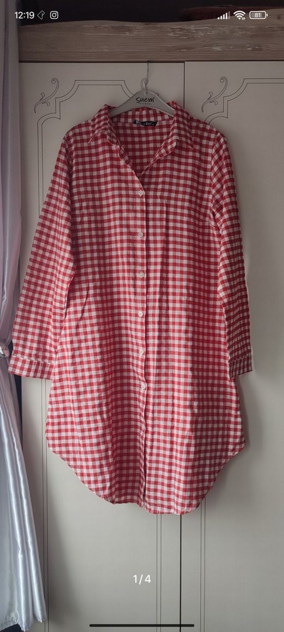Pamuk kumaştan, açık kırmızı kareli desenli, yakalı ve düğmeli önden kapamalı. Uzun kollu, midi boy ve bol kesim sokak tarzı gömlek.