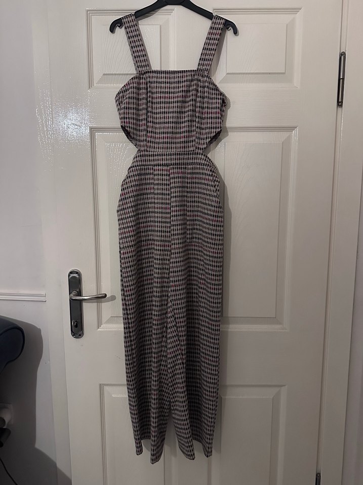 Kırmızı, siyah ve bej kareli desenli, askılı ve drapeli tasarıma sahip uzun tulum. Günlük kullanıma uygun rahat kesim sunar.