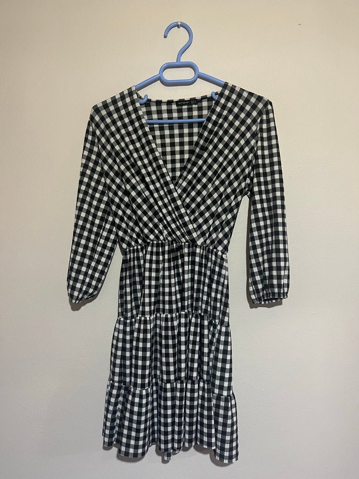 Siyah beyaz kareli, V yakalı, pileli etekli, sentetik kumaştan yapılmış, fitted midi elbise. Uzun kollu, sokak tarzında günlük kullanım için uygun.