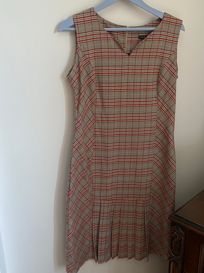 Kolsuz, V yakalı midi elbise. Kareli desenli, bej ve gri tonlarda, pilili tasarıma sahiptir. Ofis kullanımı için uygundur.