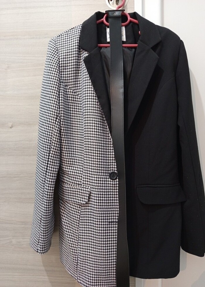 Kare kısmı önden hafif uzun çok tarz bir ceket. Ikı kez giyildi. Önden düğme ve kemer detaylı tarz ceket