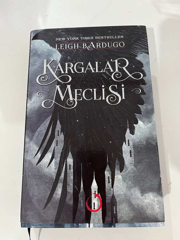 Leigh Bardugo'nun New York Times çok satan romanı Kargalar Meclisi, büyük bir karga kanadı illüstrasyonlu koyu kapaklı.