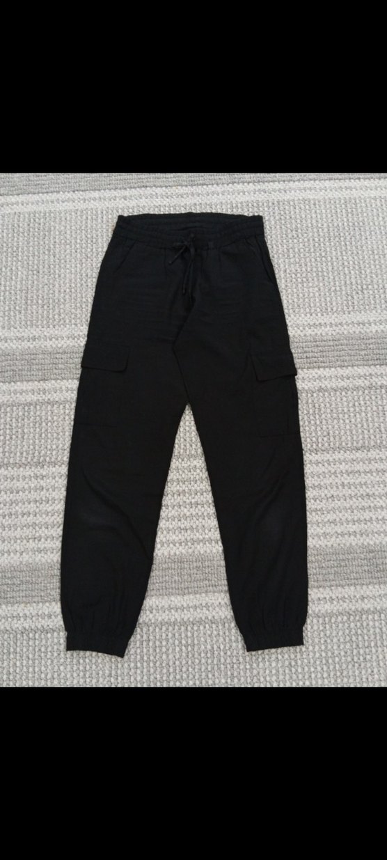 Siyah, bol kesim ve midi boy kadın kumaş pantolon. Sentetik kumaştan üretilmiş, rahat ve şık bir dış mekan sokak stili için uygundur.