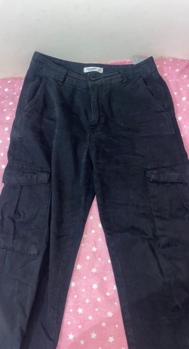 Siyah bol kesim midi kot pantolon, sokak stilinde, kullanışlı ceplere sahip. Rahat ve şık dış mekan kullanımı için uygun.