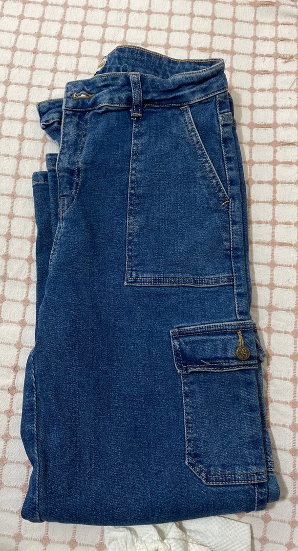Marka temsili Kargo pantolon Düğmeli, parlak mavi renkte, normal boy midi uzunluğunda, rahat kesim kot pantolon. Günlük kullanıma uygun.