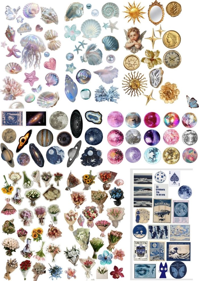 Mavi, altın ve pastel tonlarda deniz kabukları, çiçekler, gök cisimleri ve vintage desenlerden oluşan tırnak süslemeleri