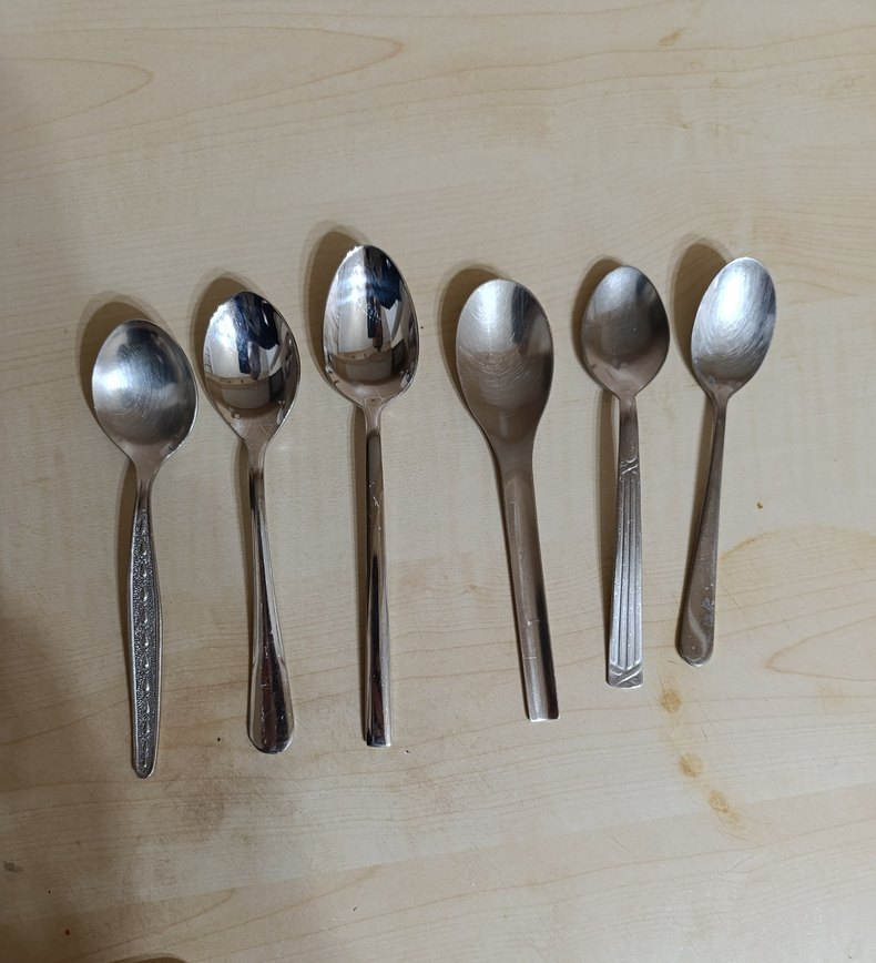 Farklı sap desenlerine sahip metal kaşık seti, parlak ve mat yüzeylerin karışımıyla. Her kaşığın sapında farklı bir desen bulunur.