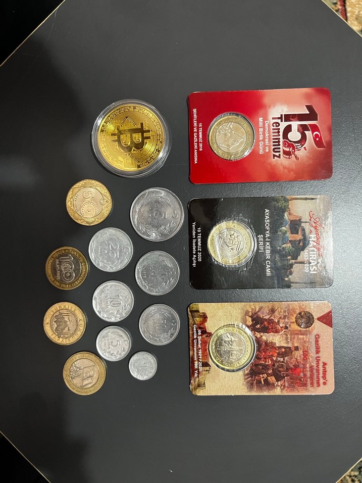 Koleksiyonluk çeşitli madeni paralar ve anı kartları içeren koyu altın renkli set