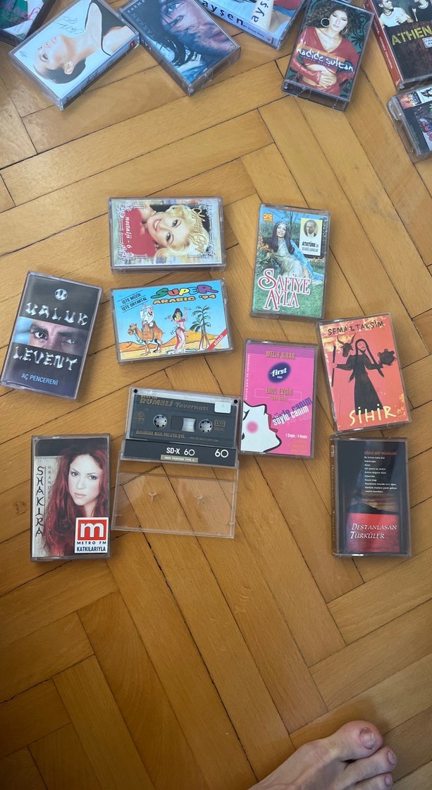 Farklı sanatçı ve albümlerden oluşan çeşitli kaset koleksiyonu, şeffaf SD-X 60 kaset dahil.