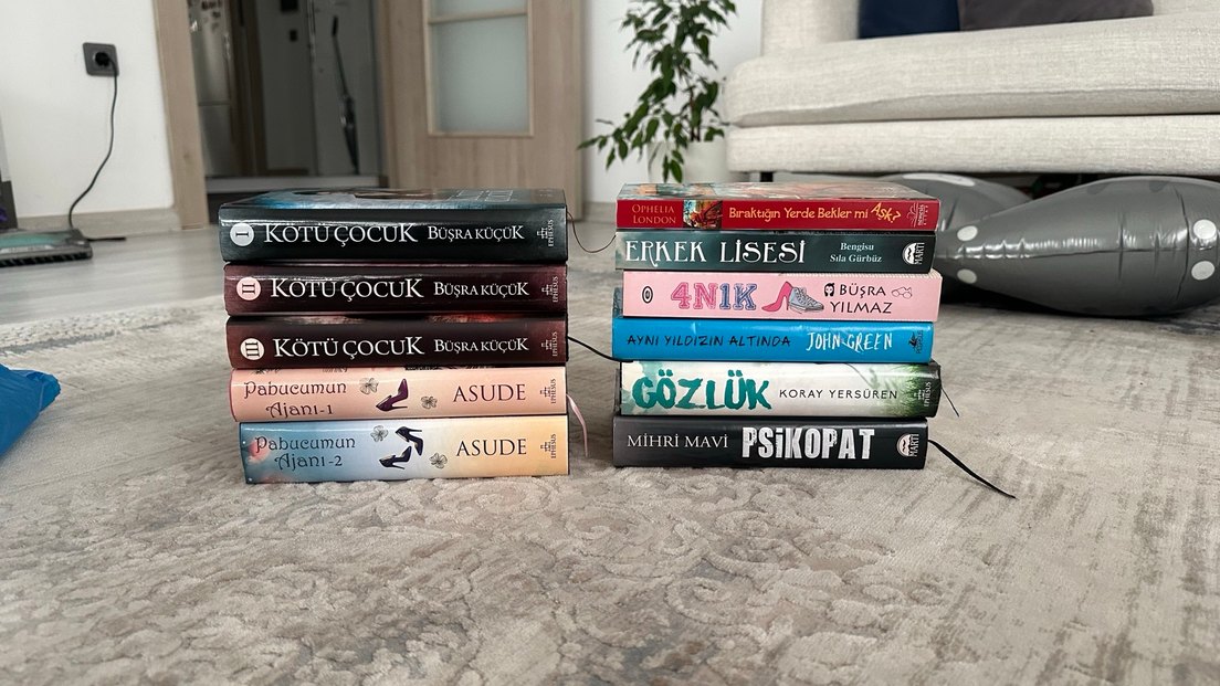 Fotoğraftaki kitapların hepsi (tek tek alınabilir). Kötü Çocuk 1 (1 kere okundu, sert kapak) Kötü Çocuk 2 (1 kere okundu, sert kapak) Kötü Çocuk 3 (yeni, sert kapak) Pabucumum Ajanı 1 (yeni, sert kapak) Pabucumum Ajanı 2 (yeni, sert kapak) Bıraktığın Yerde Bekler mi Aşk? (yeni, karton kapak) Erkek Lisesi (1 kere okundu, karton kapak) 4N1K (yeni, karton kapak, posterli) Aynı Yıldızın Altında (1 kere okundu, sert kapak, dışındaki kağıt kapak biraz hasarlı) Gözlük (1 kere okundu, sert kapak, posterli) Psikopat (yeni, sert kapak, posterli)