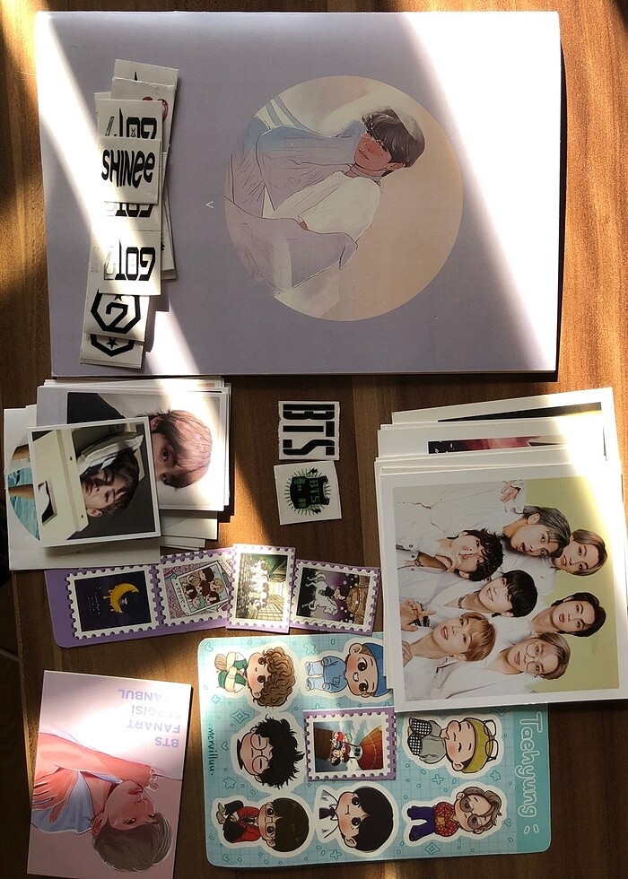 hepsini toplu satıyorum❗️içindekiler: 1 bts taehyung fanart defter 40 adet sticker (bts, exo, shinee, got7) 1 bts taehyung anahtarlık 8 adet postcard 9 adet photocard (hepsi fan yapımı ürünler)