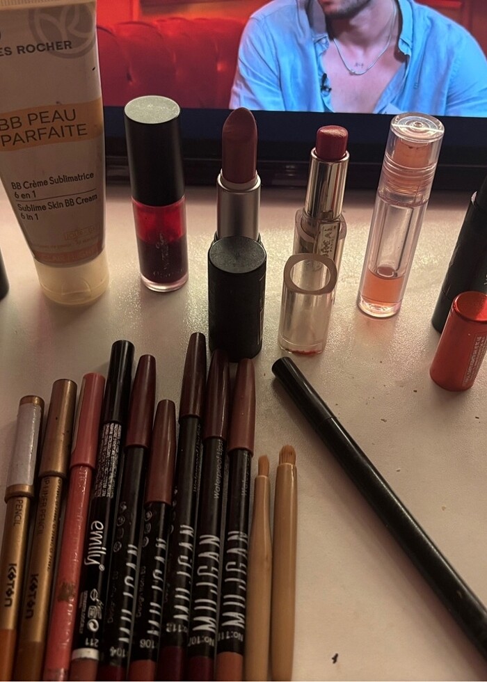 Yarısından fazla dolu açık renk Yves Rocher bb krem ve gabrini fondoten 2 tane L’Oréal ruj 1 flormar tint 1 golden rose gloss 1 Pierre Cardin ruj 1 tane çift taraflı eyeliner 2 tane far fırçası koton essence mutfak ve Emily markalı dudak kalemleri hepsi toplu şekilde satılıyor