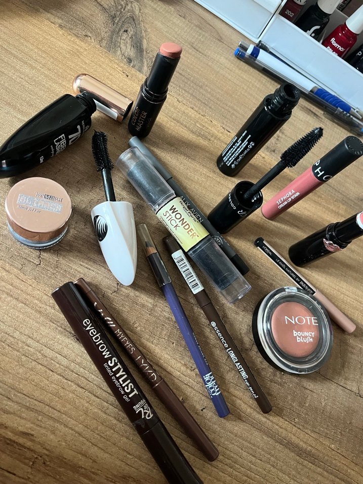 Note markalı ve diğer markalardan koyu bej tonlarında kaş kalemleri, maskara, allık ve fondöten çubukları içeren makyaj seti.