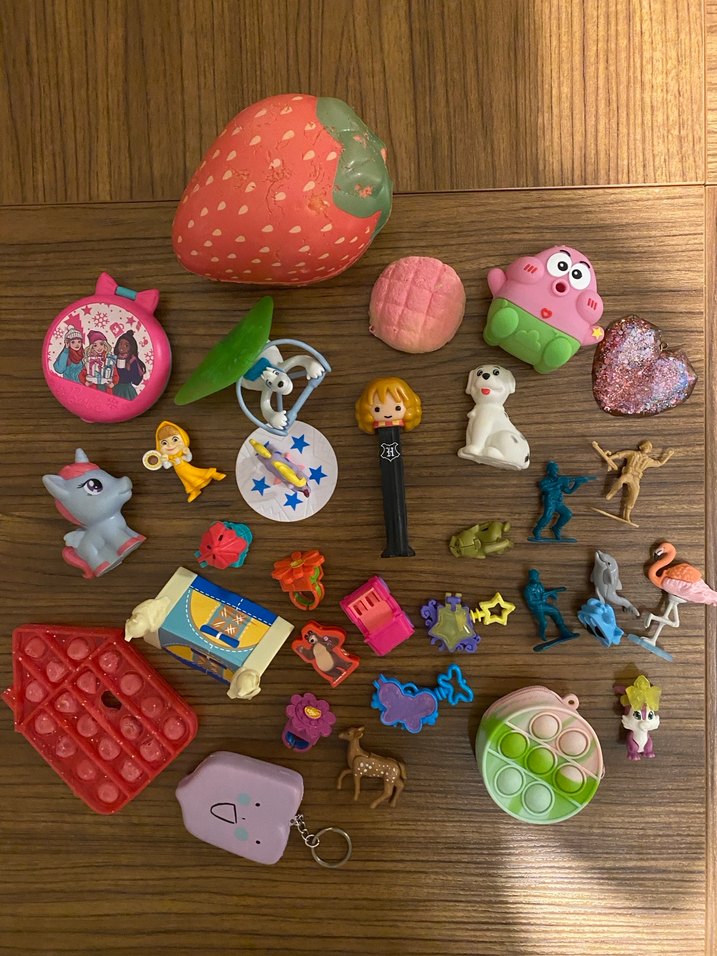 Karışık pinyata oyuncakları, figürler. Tamamı 600 tl Çeşitli figürler, pop-it oyuncaklar ve eğlenceli şekiller içeren renkli küçük oyuncak seti.