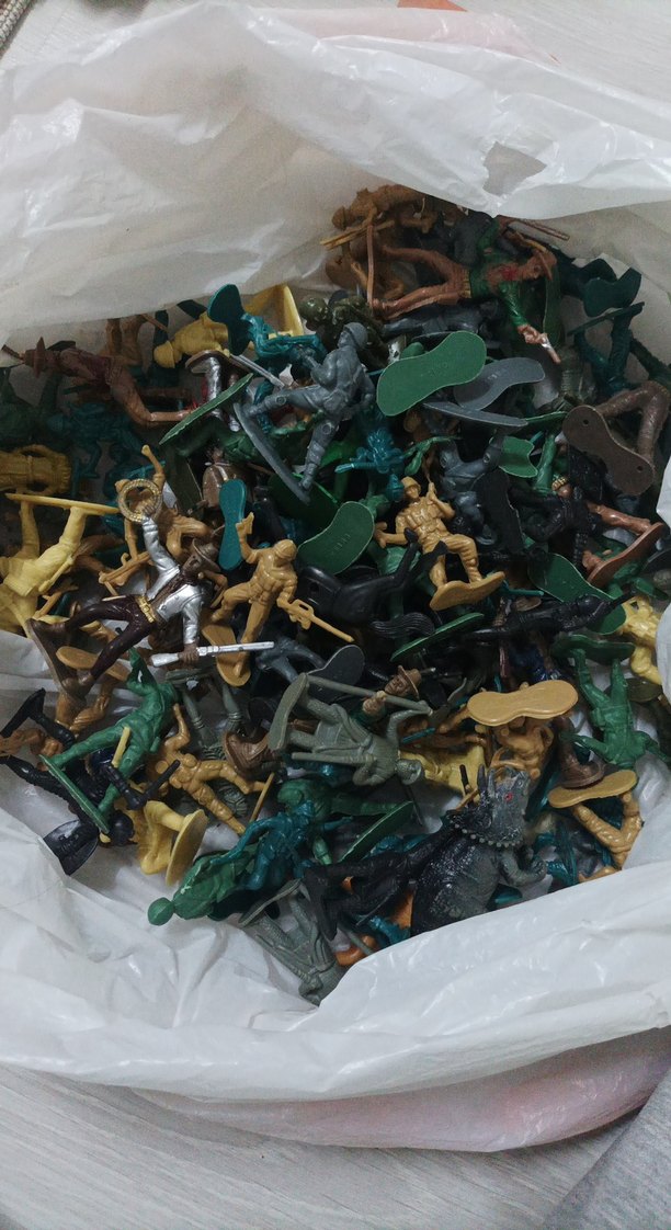 Farklı poz ve silahlara sahip koyu ve haki renklerde çeşitli aksiyon figürlerinin torba içinde karışık seti. 120 tanedir.