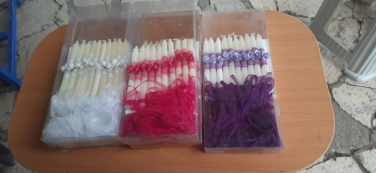 Çiçek ve kurdele detaylı dekoratif mumlar, set halinde düzenlenmiş. Sıcak bir ortam yaratmak için uygun. ️ 3 pkt ksrgolanacaktır