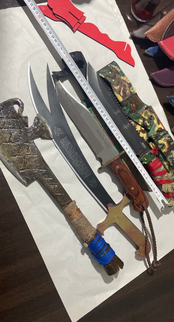 Çeşitli desenlere sahip, ahşap saplı ve koruyucu kılıflı koyu tonlu çok renkli kesici aletler seti.