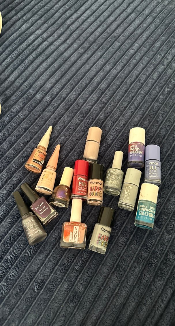 Gri ve canlı renkler içeren, farklı marka ve bitişlere sahip karışık renkli oje seti. Minimum 3 tane verebilirim çoğunu kullanmadım protez tırnak yapıyorum bu nedenle bir süredir duruyorlar