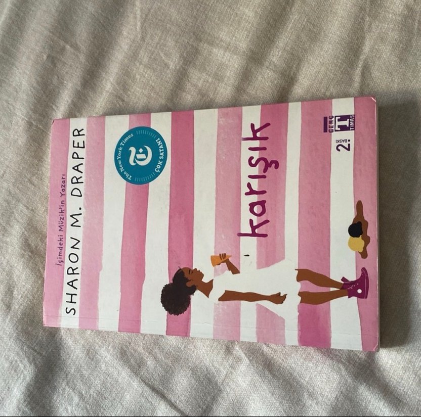 Sharon M. Draper'ın "Karışık" adlı romanı, pembe beyaz çizgili kapaklı etkileyici bir hikaye sunar. İkinci el ve üzerinde 22 numarası bulunur.