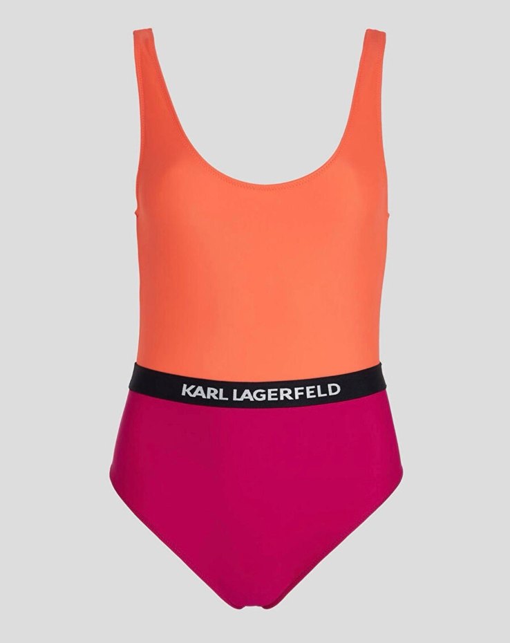 Fitted kesim, askılı ve kemerli bel detaylı Karl Lagerfeld kadın mayo. Koyu pembe ve turuncu renkleriyle spor ve athleisure tarzına uygun.