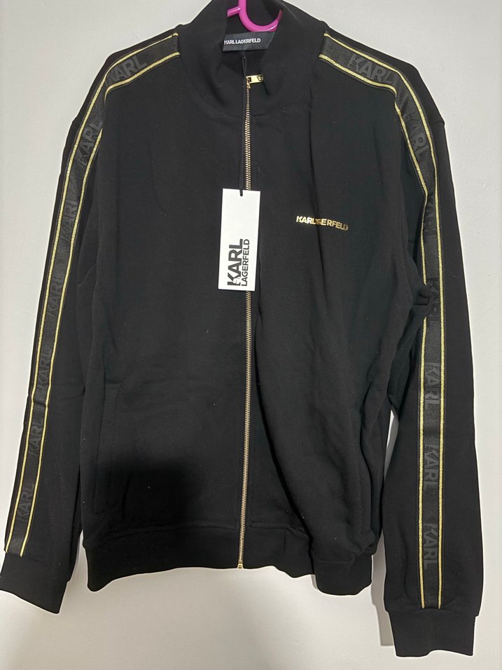 Siyah Karl Lagerfeld sweatshirt, fermuarlı, uzun kollu ve bol kesimdir. Yuvarlak yaka ve kollarında altın renkli marka detayları bulunur. Spor giyim için uygundur. %100 orjinaldir ve sıfırdır