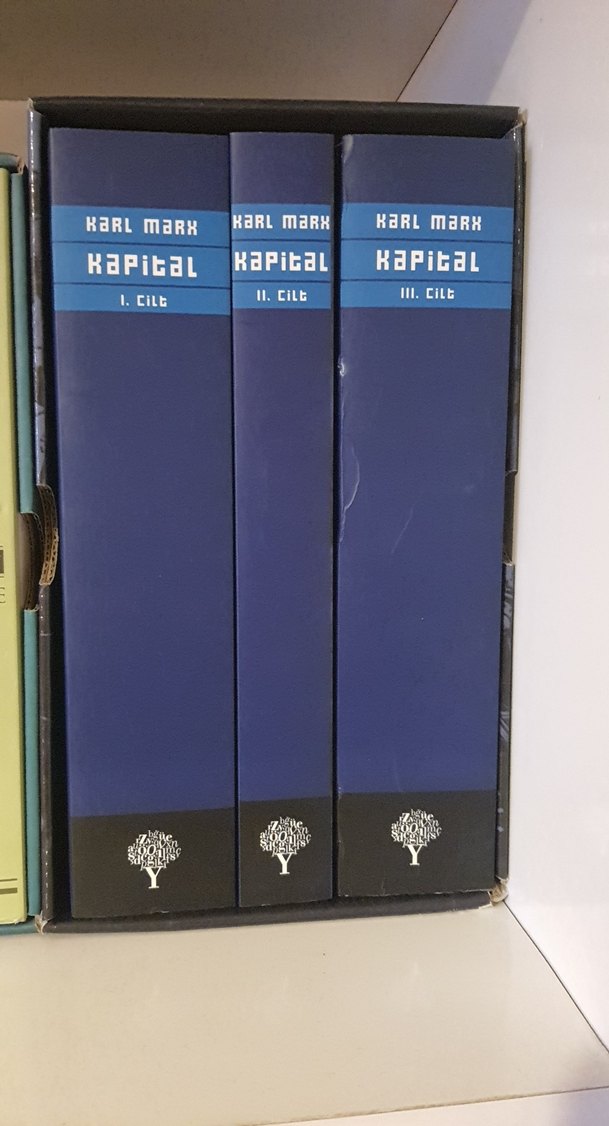 Karl Marx'ın Kapital adlı eseri 3 cilt halinde, koyu mavi kapaklı ve sırtında beyaz yazılı set.