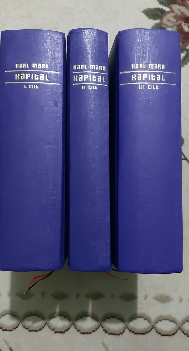 Karl Marx'ın Kapital adlı eseri, mavi kapaklı ve altın yaldızlı harflerle yazılmış üç ciltlik set. Ekonomi ve felsefe çalışmaları için uygun.