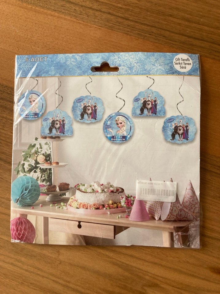 Pastel mavi renkte Elsa ve arkadaşlarının resimleriyle süslenmiş doğumgünü parti süsü seti. İçindekiler için görseller ile birlikte aşağıdaki açıklamaları inceleyiniz. * 6 Adet Karlar Ülkesi Temalı Sarkıt Tavan Süsü (sıfır ürün) * 11 Adet Karışık Desen ve İki Farklı Ebatta Karlar Ülkesi Temalı Patlamış Mısır Kutusu * 1 Adet Karlar Ülkesi Temalı Mavi Simli Eva Kurdele Diğer ilanlarımda Elsa doğumgünü afişi ve Karlar Ülkesi figür oyuncakları da bulunuyor ❄️