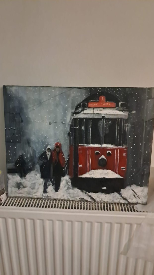 Bu yağlı boya tablo, kar yağışı altında koyu kırmızı bir tramvayı ve yanında yürüyen iki kişiyi gösteriyor. Kış mevsimini ve nostaljik tramvayı yansıtıyor. ❄️