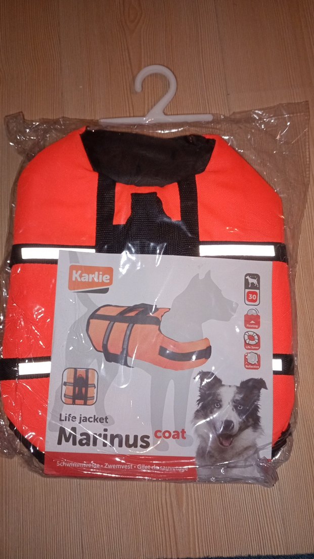 Karlie markalı turuncu renkli, baskılı biker tarzı köpek yaşam ceketi, cırt cırtlı kapama ile güvenli oturuş sağlar. Canlı koyu renkli.