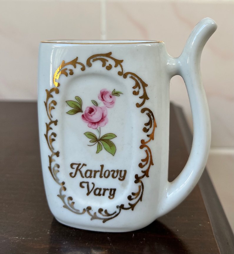 Karlovy Vary yazılı, çiçek ve altın detaylı beyaz porselen kupa ☕