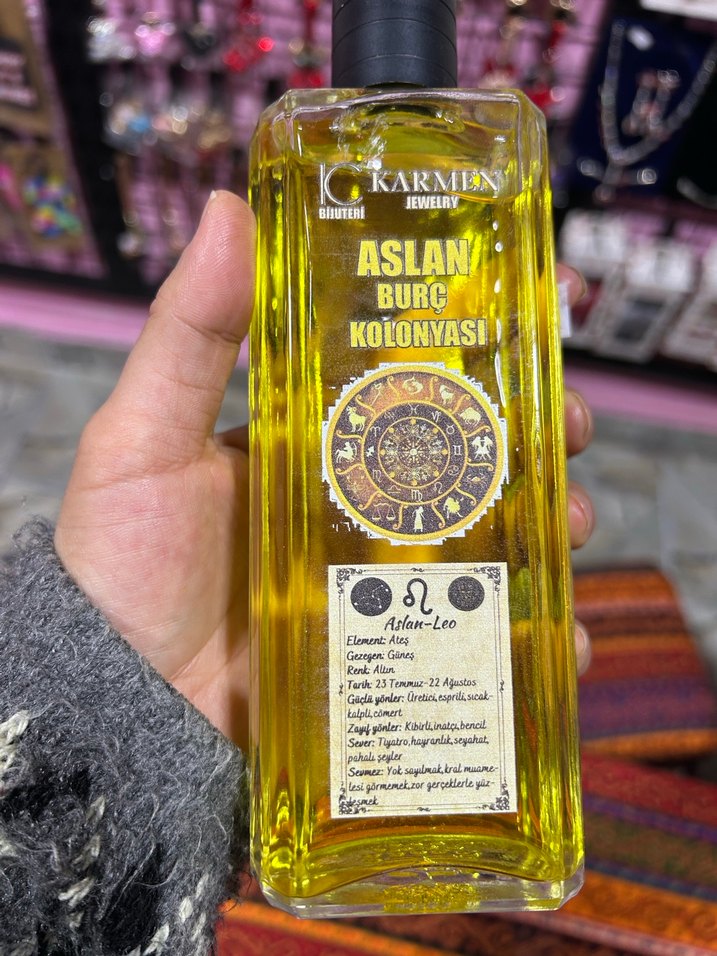 Karmen markasının Aslan burcuna özel kadın kolonyası, burç sembolleriyle tasarlanmış şişede sunulmaktadır.